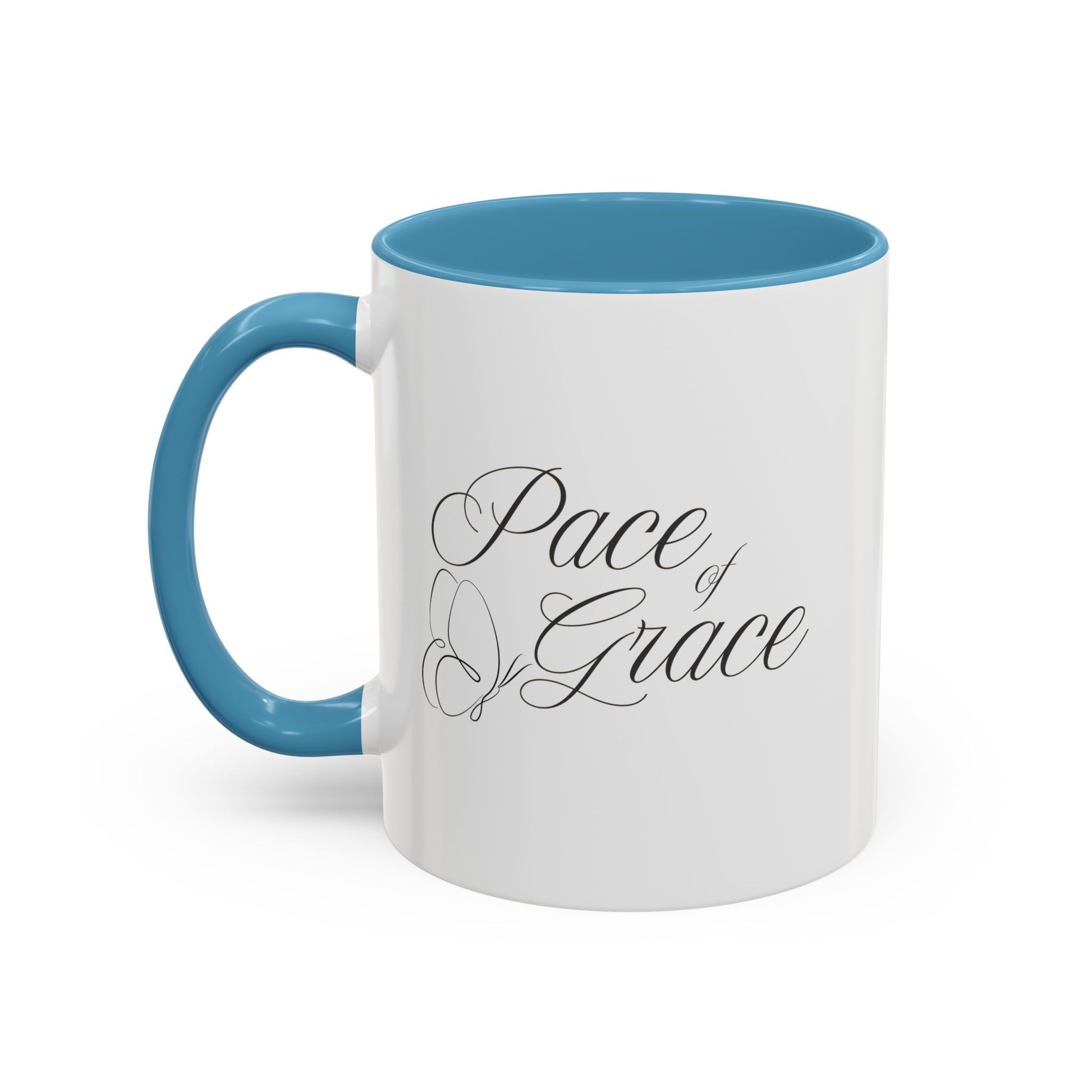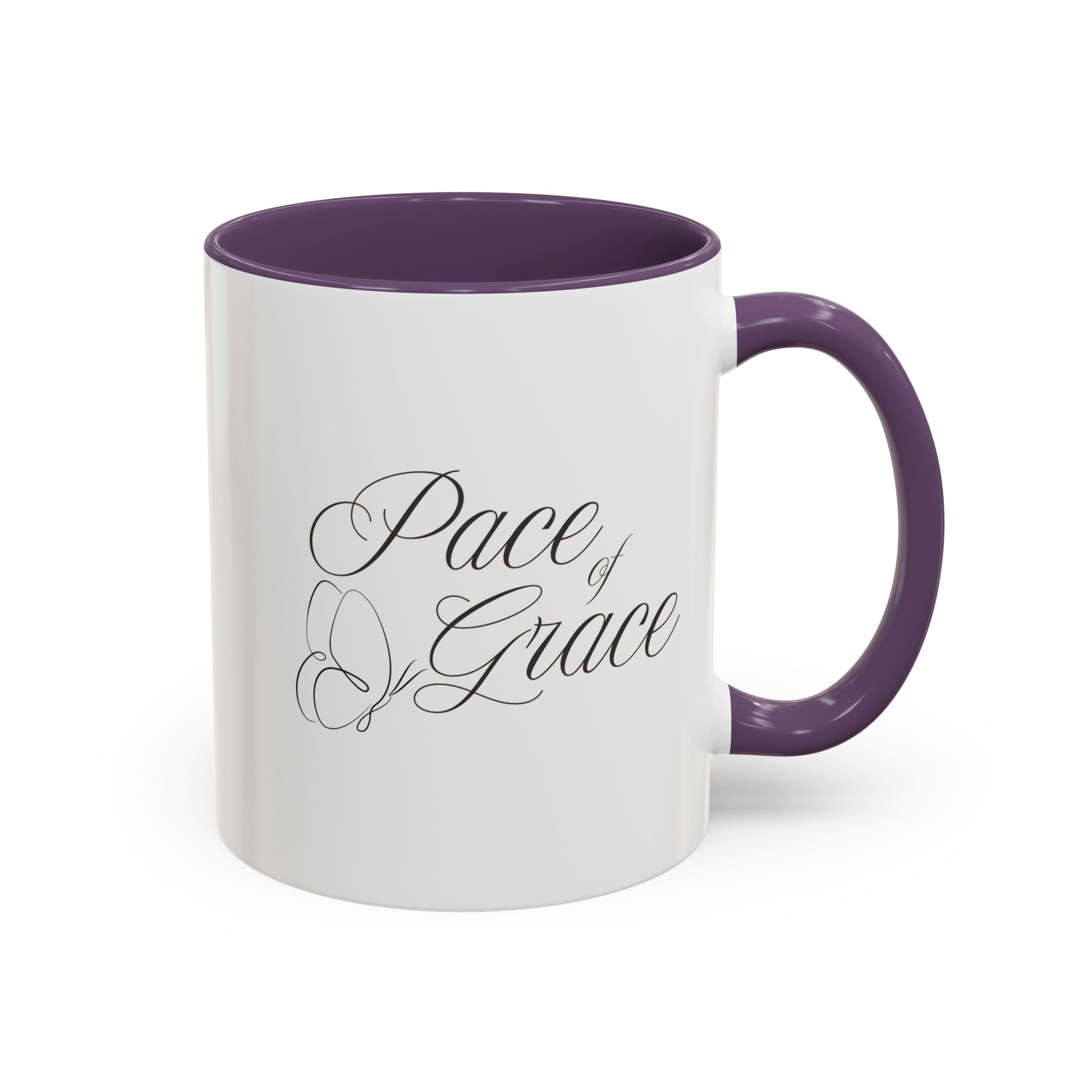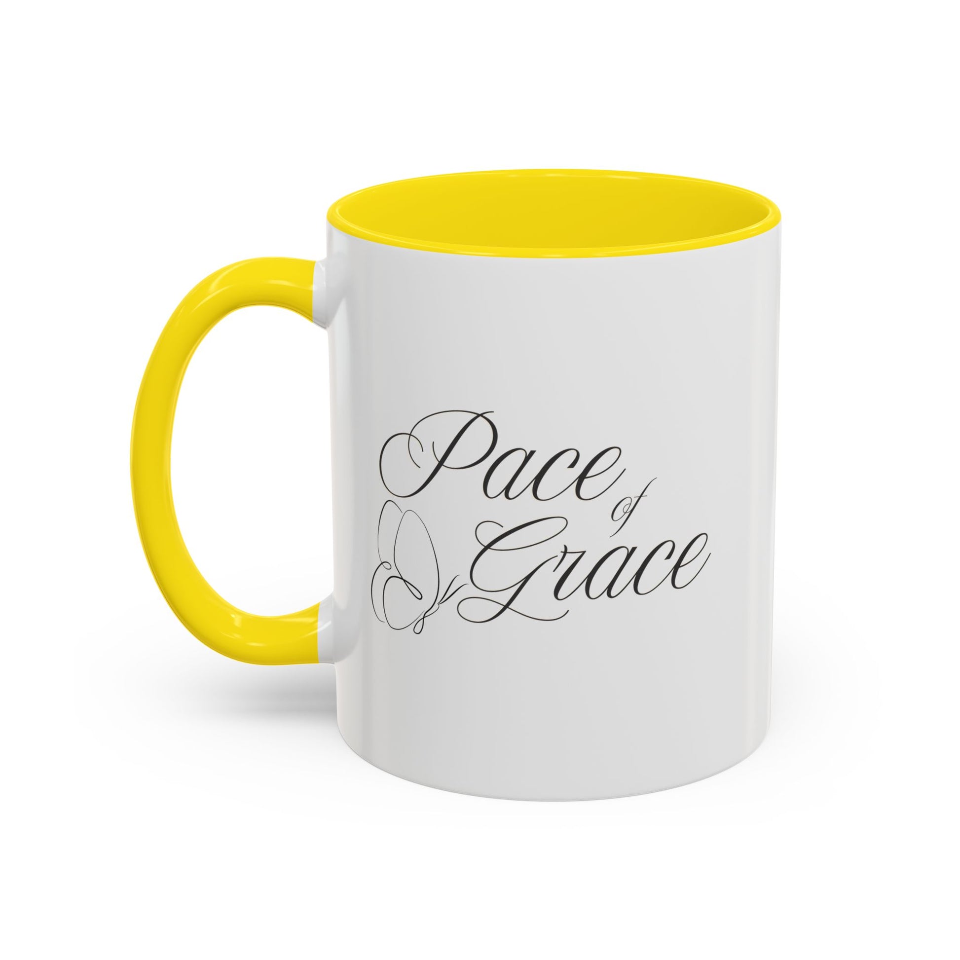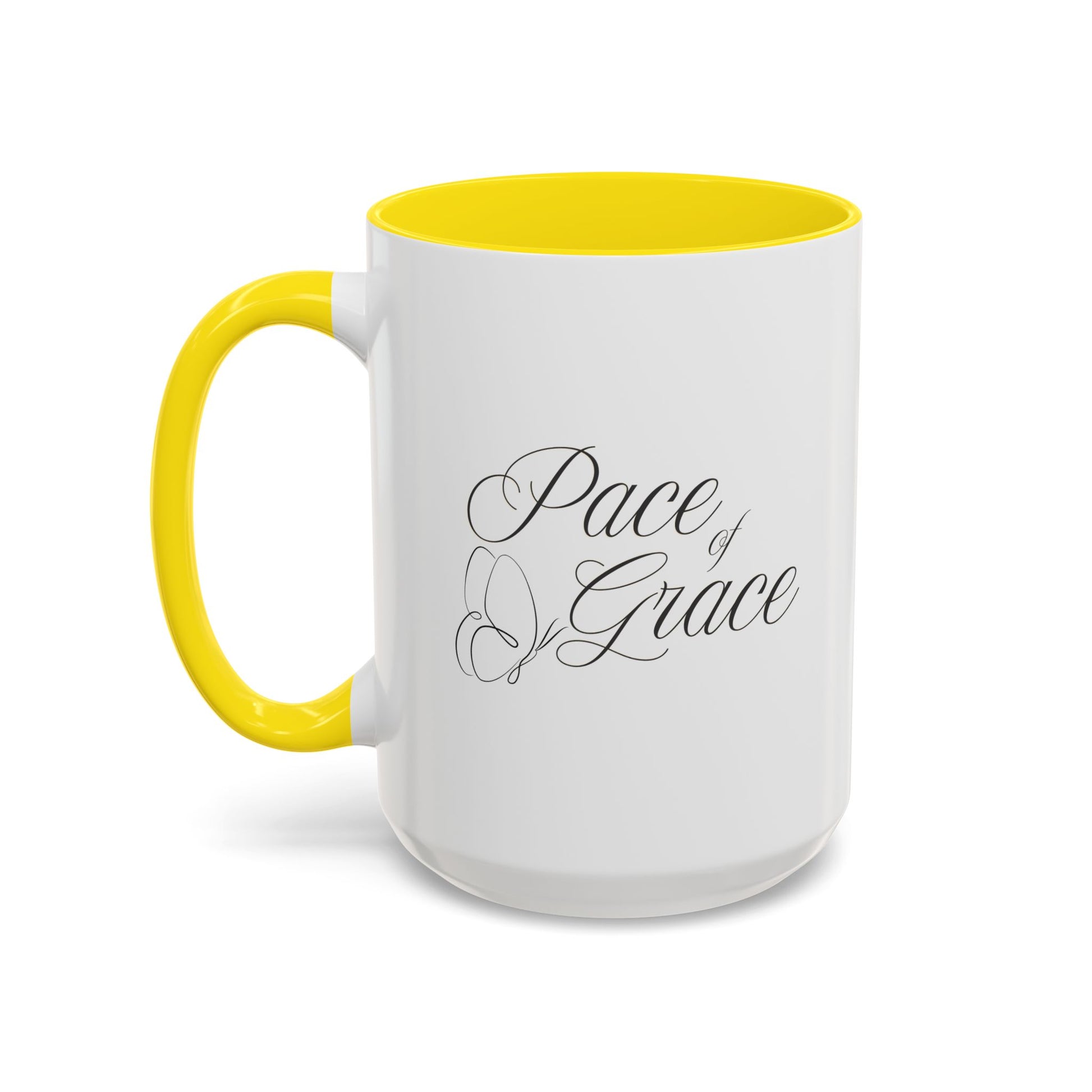 A stylish coffee mug featuring the phrase 'Pace of Grace' on it, double sided print. This mug exudes a calming and peaceful vibe, perfect for enjoying your morning coffee or tea. Ideal for anyone looking to add a touch of positivity to their daily routine. Great for gifting on birthdays, Mother's Day, or as a Thank You gesture. Product features - Microwave and dishwasher safe - Vibrant colors with crisp printing - Available in two sizes: 11oz and 15oz - Multiple interior and handle colors to choose from - Lead and BPA-free Care instructions - Clean in dishwasher or wash by hand with warm water and dish soap